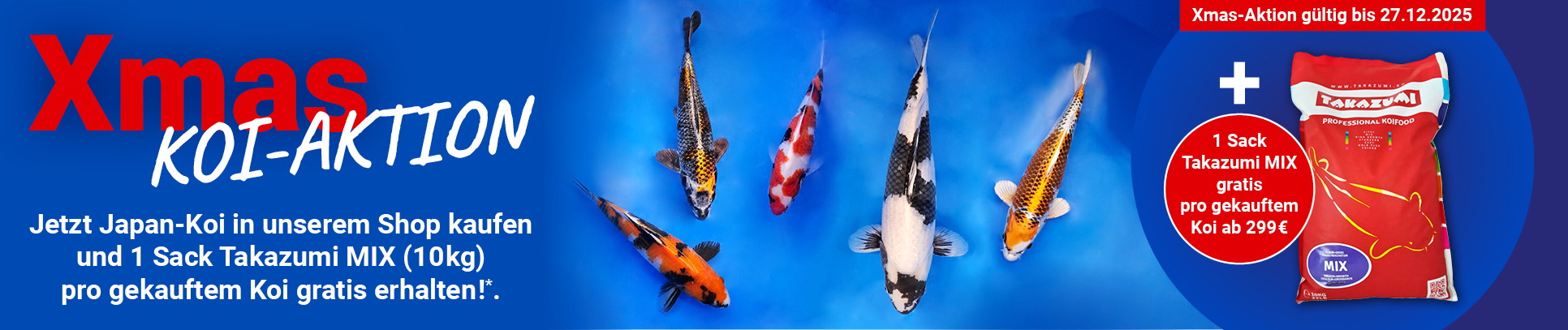 Sie erhalten pro gekauften Koi jeweils 1 Sack Takazumi MIX 10 kg gratis. Gilt nur pro Koi mit einem Preis ab 299 €.